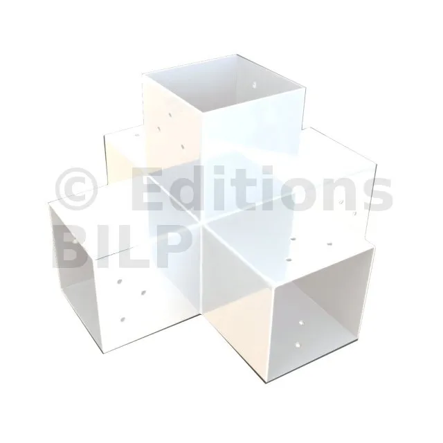 Il permet de raccorder deux poutres 120x120mm perpendiculairement à une autre poutre 120x120mm, le tout étant supporté par un poteau vertical de 120x120mm.