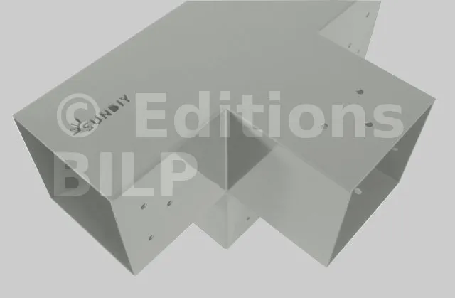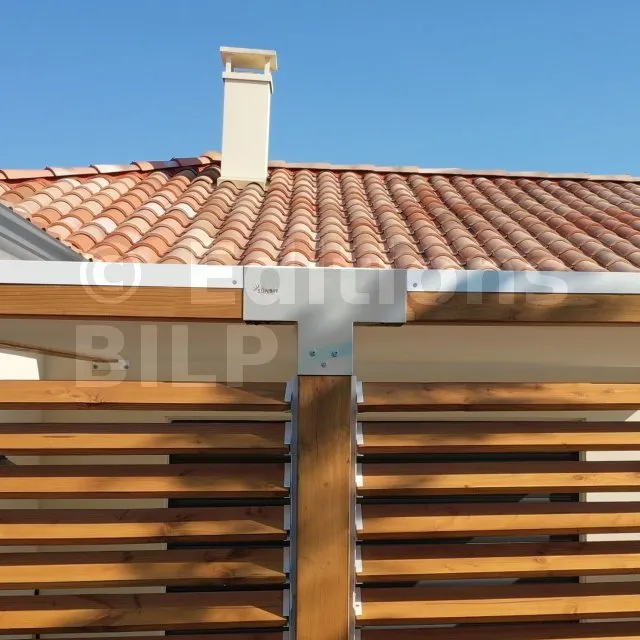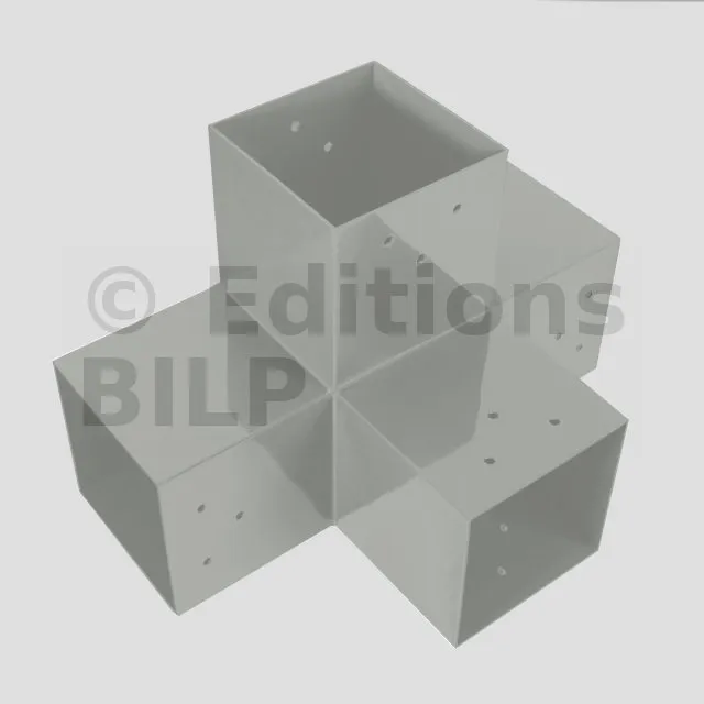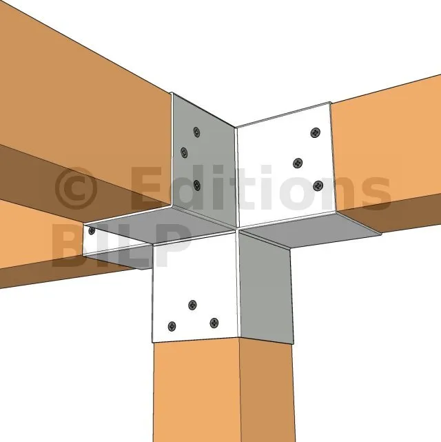 Il permet de raccorder une poutre de 90x90mm perpendiculairement à un chevron de 90x90mm, le tout étant supporté par un poteau vertical de 90x90mm.