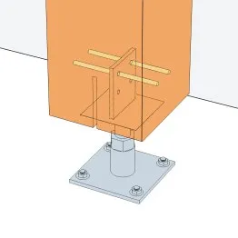 La connexion entre le pied de poteau et le poteau bois s’effectue à l’aide des deux broches supérieures.